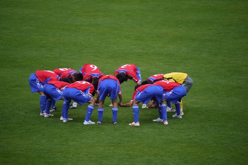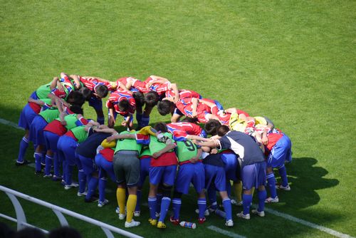 試合開始前最後の監督からのお言葉に耳を傾けるスタメン陣。